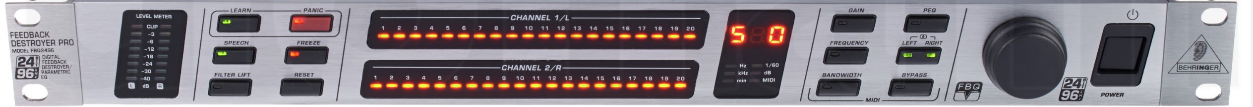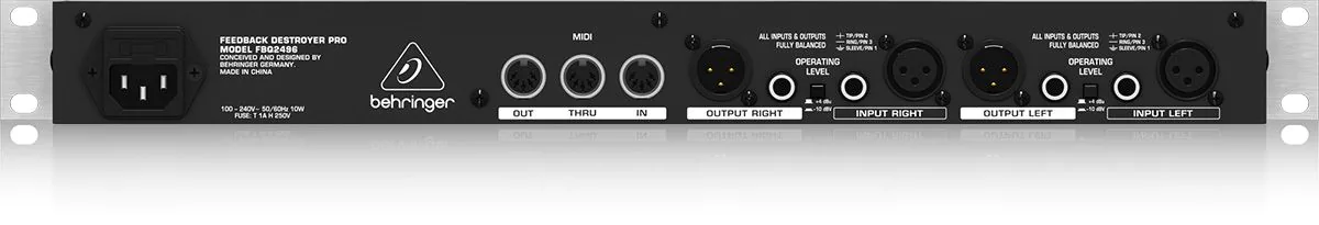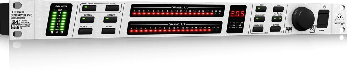 BEHRINGER FBQ2496 là thiết bị kỹ thuật số với khả năng phát hiện tần số bị hú đến 0,2 giây trong 1/60 của quãng tám EQ giúp loại bỏ hiệu quả phản hồi và tối đa hóa chất lượng âm thanh.