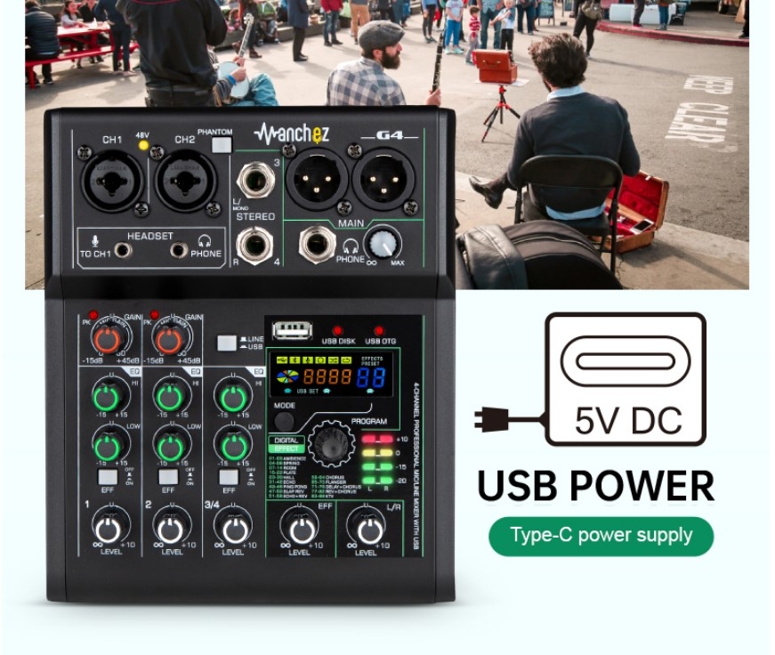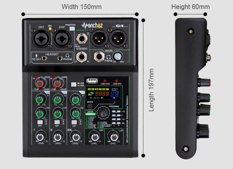 HIKVOICE MINI G4 24Bit 99DSP Effects 192KHz Sampling Frequency Bluetooth Mini Audio Mixer with USB Record and 48V Phantom Power