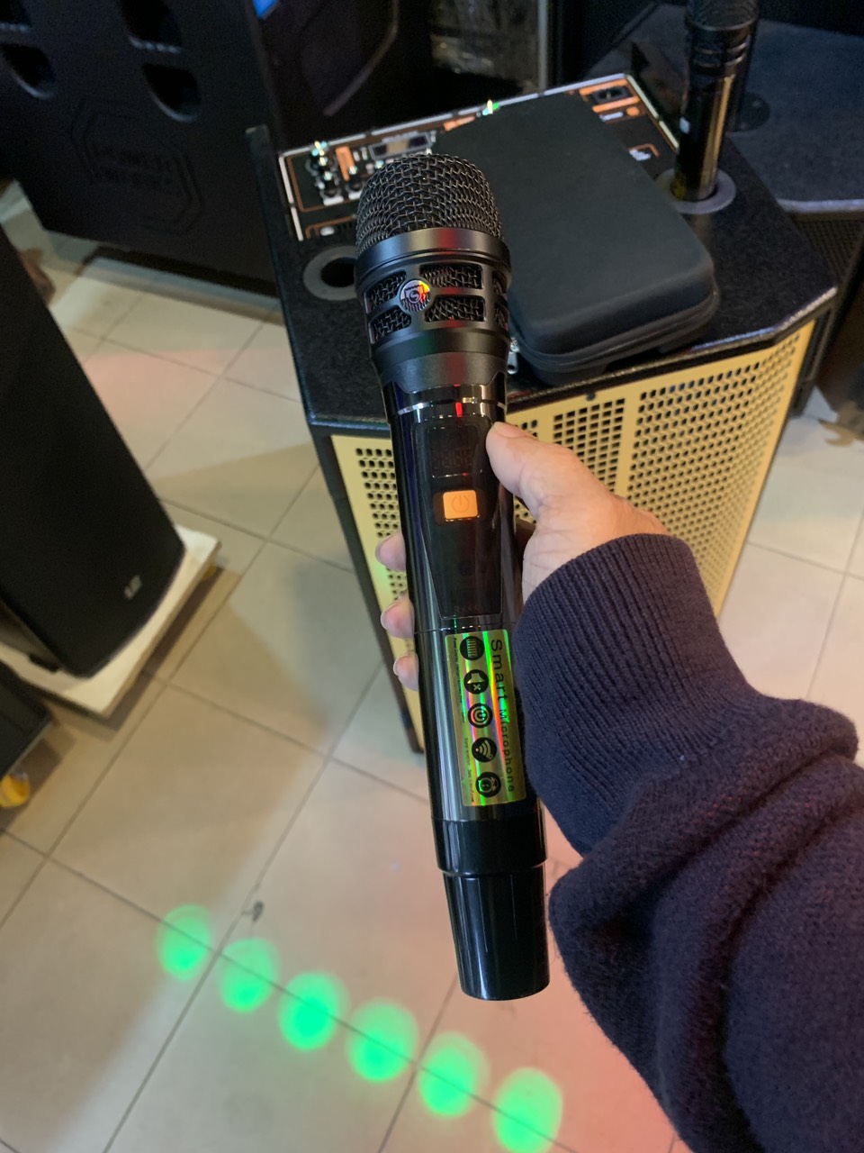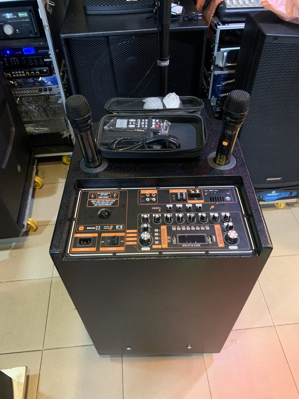 Trọn bộ: Loa kèm 2 micro không dây, bao vài đựng micro.
