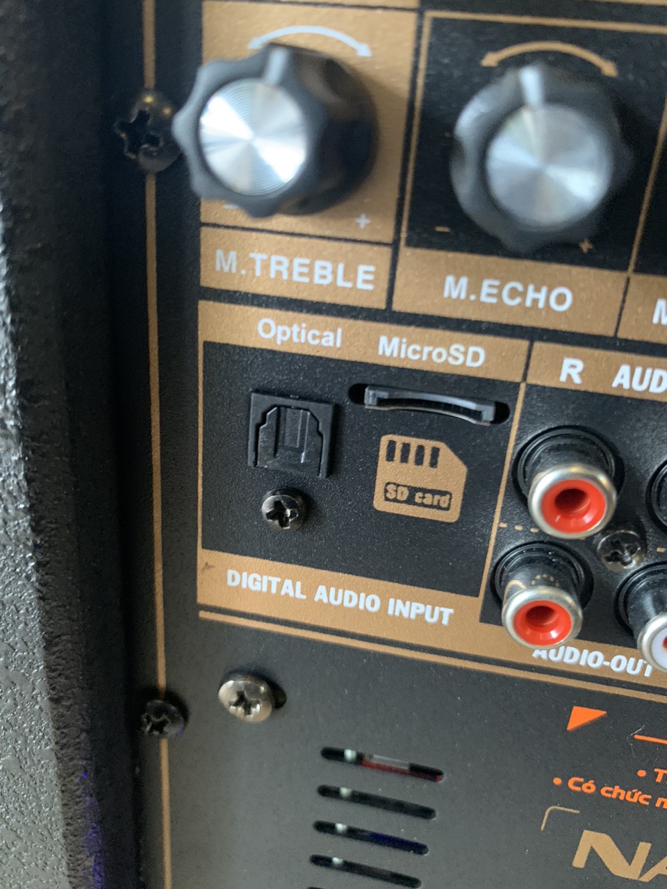 Cổng USB/ SD Card / MMC, Bluetooth, GT.IN(cổng cắm nhạc cụ),Audio input( cổng nhận và phát âm thanh), Audio out (cổng xuất âm thanh, kết nối thêm loa Sub để tăng công suất), MIC1/ MIC2 (cổng cắm microphone 6.5mm), HDMI .